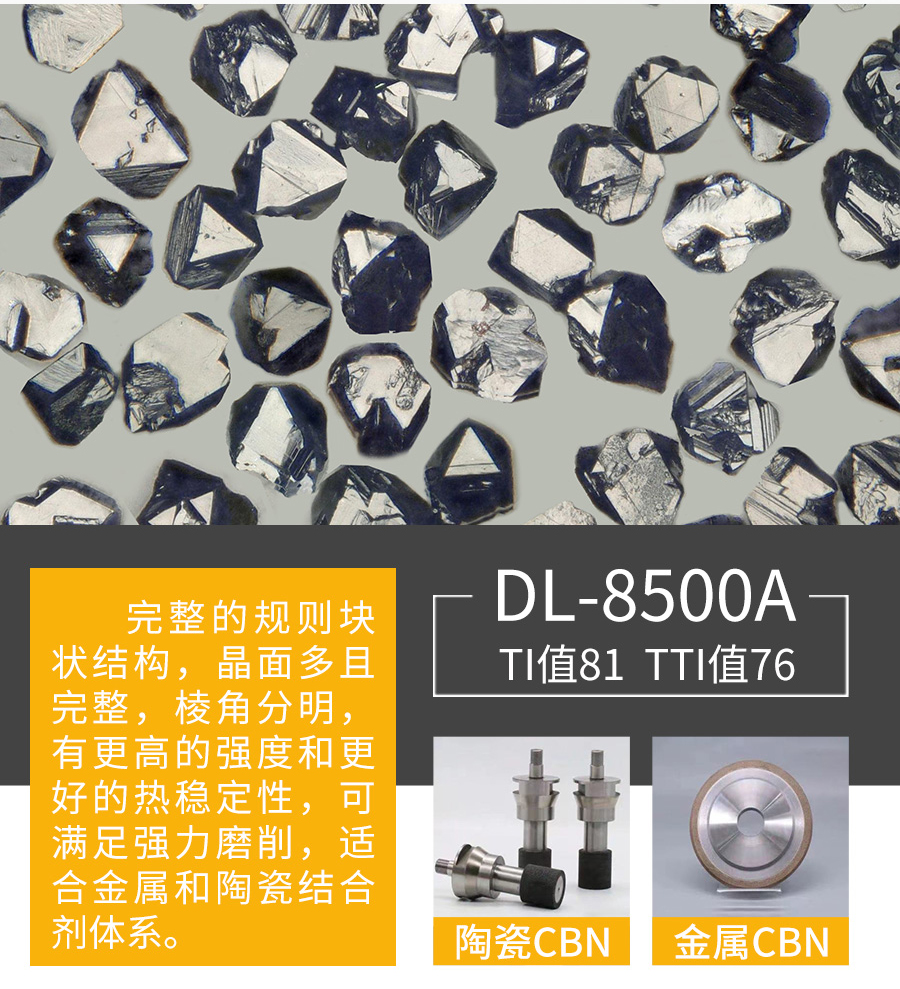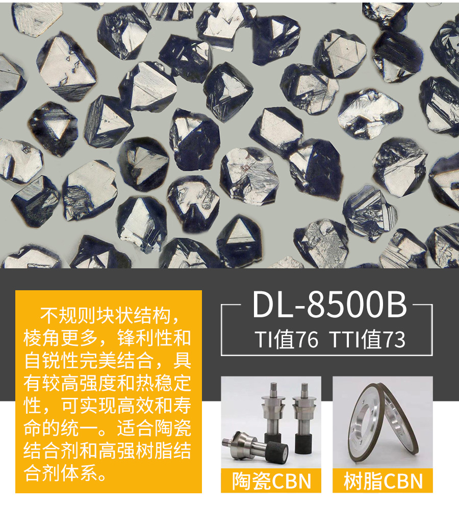 DL8500系列黑色CBN單晶,在磨具材料領(lǐng)域大放異彩。無(wú)論是與金屬、樹脂、電鍍還是陶瓷等結(jié)合劑攜手,都能形成性能卓越的磨具。其獨(dú)特的棱角設(shè)計(jì),使得由它制成的砂輪擁有出色的磨削性能與自銳性,尤其擅長(zhǎng)應(yīng)對(duì)黑色金屬等難加工材料,實(shí)現(xiàn)高效、高精度的磨削作業(yè),砂輪壽命也顯著提升。