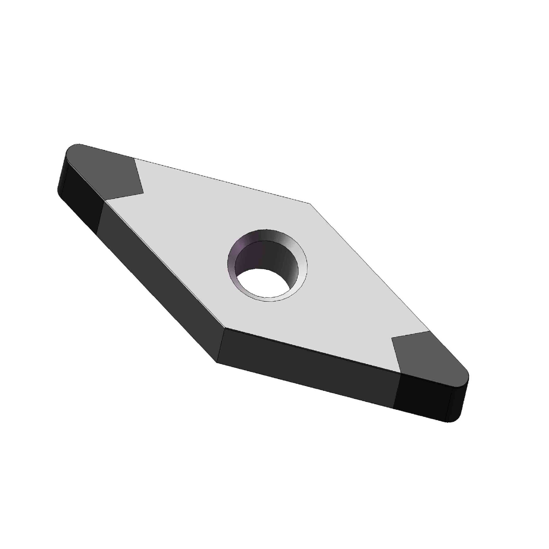 該類V型PCBN整體焊接刀片(VNGA160408)的刀頭精致小巧,耐磨性高,可承受更大的切削力?,F(xiàn)采用真空焊接取代原來的高頻焊接,整體焊接取代原來的單面焊接。先進的加工工藝提高了刀頭與刀體結合強度,相對之前整體復合刀片,避免了CBN層脫層帶來的加工問題,經(jīng)久耐用,減少換刀時間,降低刀具使用成本。由于采用整體焊接技術刀片兩面均可加工增加切削刃,提高了刀具利用率。